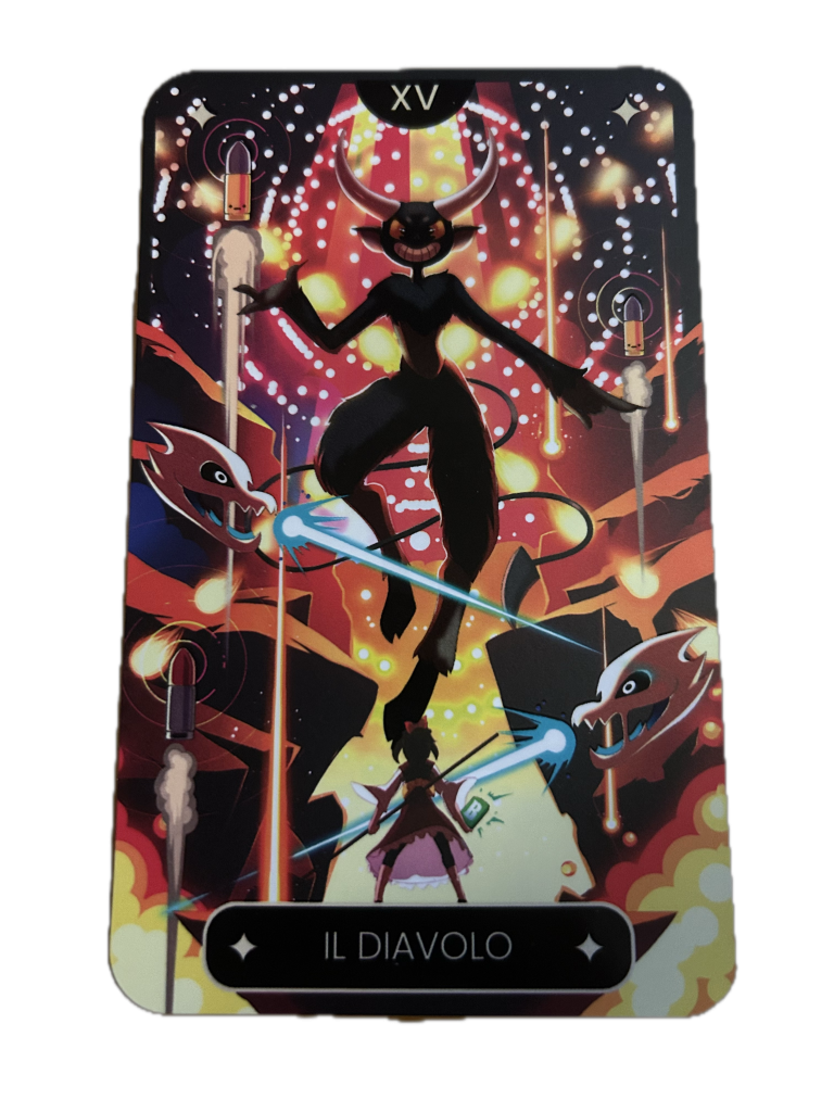 Mi piacerebbe dire che è una metafora di come nei giochi rappresentati nella carta si sta facendo riferimento a scelte morali che hanno poi portato a questa battaglia (si veda Undertail e Cuphead che hanno i combattimenti presenti nella carta solo dopo aver fatto delle scelte nel gioco) ma l’autrice Ckibe ammette nel documentario che il riferimento è Diavolo->Inferno->Hell->BulletHell semplice semplice.