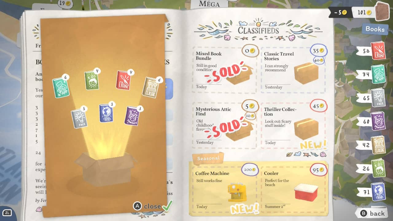 Altra meccanica estremamente interessante è il suggerimento dei libri. Durante la giornata, mentre vendi libri, i clienti potrebbero chiederti pareri sui libri, in quanto non riescono a trovare qualcosa che segua le loro indicazioni. Personalmente sono entusiasta nel consigliare i libri soprattutto avendo una lista ridotta di libri e dovendo trovare il libro giusto da consigliare anche in base alla mia personale conoscenza (sono un lettore accanito).