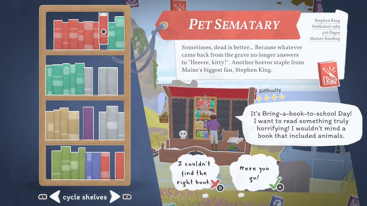 Altra meccanica estremamente interessante è il suggerimento dei libri. Durante la giornata, mentre vendi libri, i clienti potrebbero chiederti pareri sui libri, in quanto non riescono a trovare qualcosa che segua le loro indicazioni. Personalmente sono entusiasta nel consigliare i libri soprattutto avendo una lista ridotta di libri e dovendo trovare il libro giusto da consigliare anche in base alla mia personale conoscenza (sono un lettore accanito).